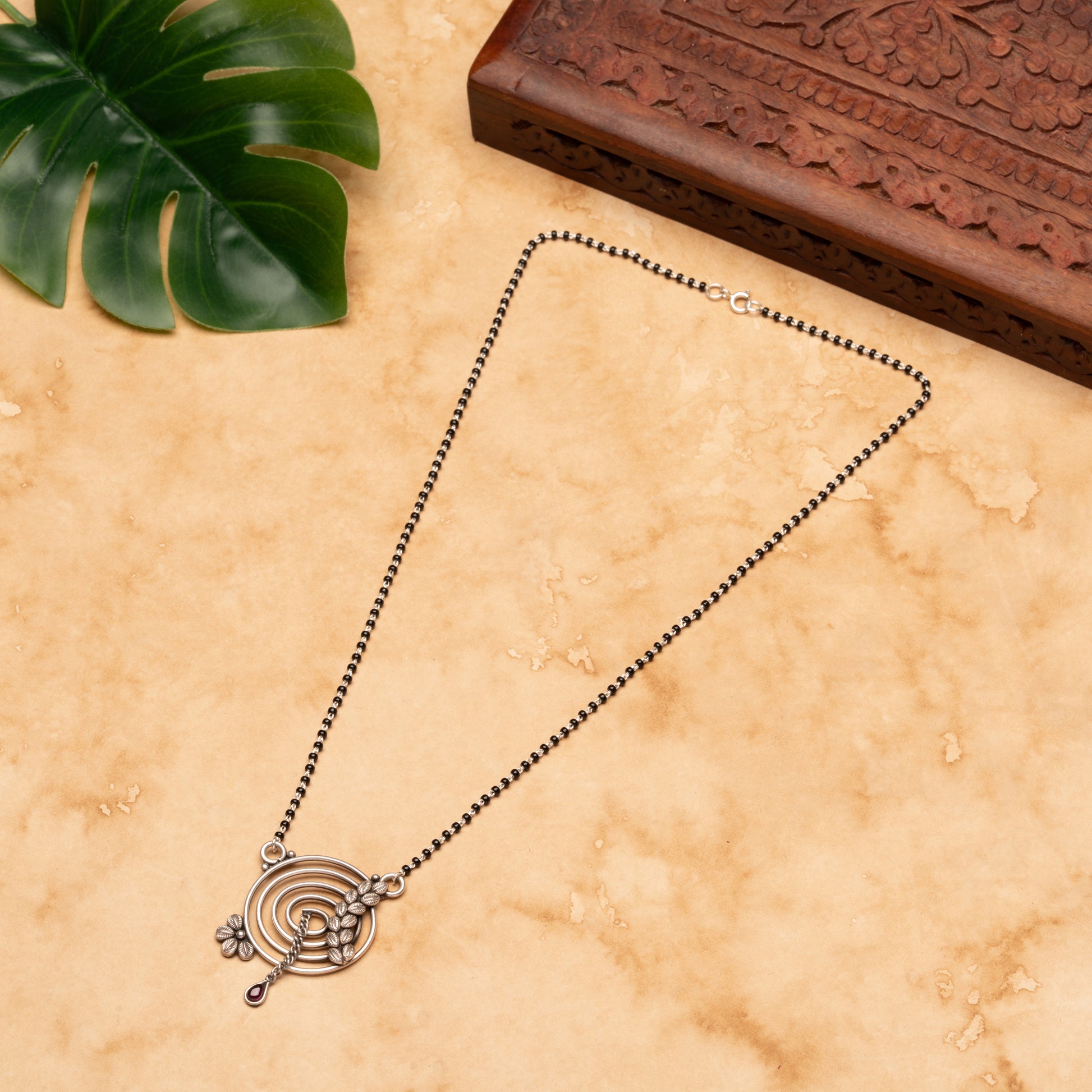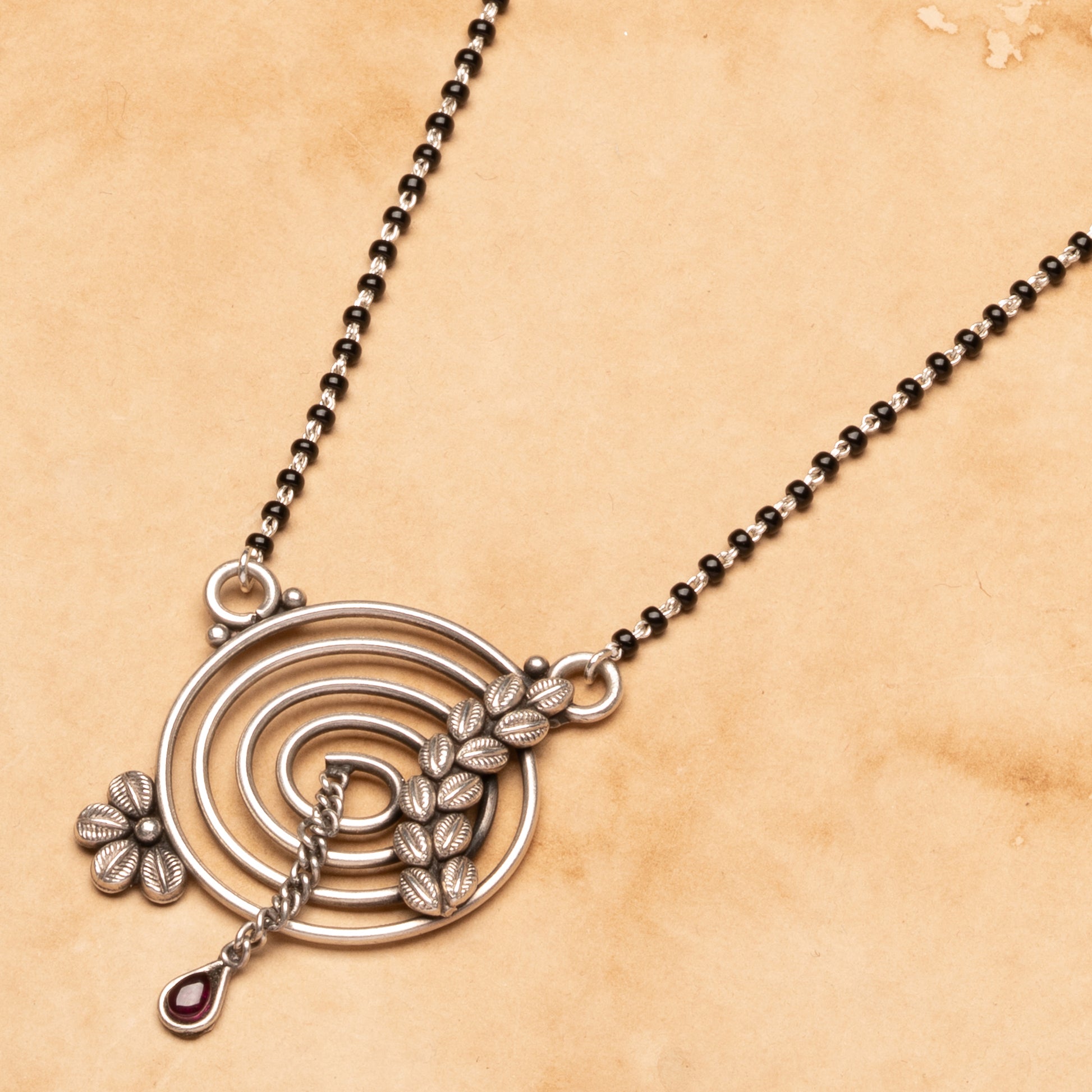The Aranya Handmade Spiral Mangalsutra draws inspiration from the quiet strength of nature, featuring a graceful spiral pendant intertwined with a delicate leaf motif, handcrafted in 925 sterling silver and suspended from a strand of traditional black beads. The spiral represents continuity and eternal connection, while the leaf symbolizes growth, harmony, and new beginnings — coming together in a design that is both rooted in tradition and effortlessly modern, making it perfect for everyday wear and meaningful occasions alike.