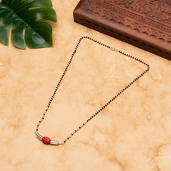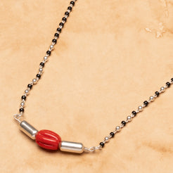 The Coral Bliss Silver Mangalsutra features twin silver cylinder beads that flank a vibrant coral centre stone, all s...