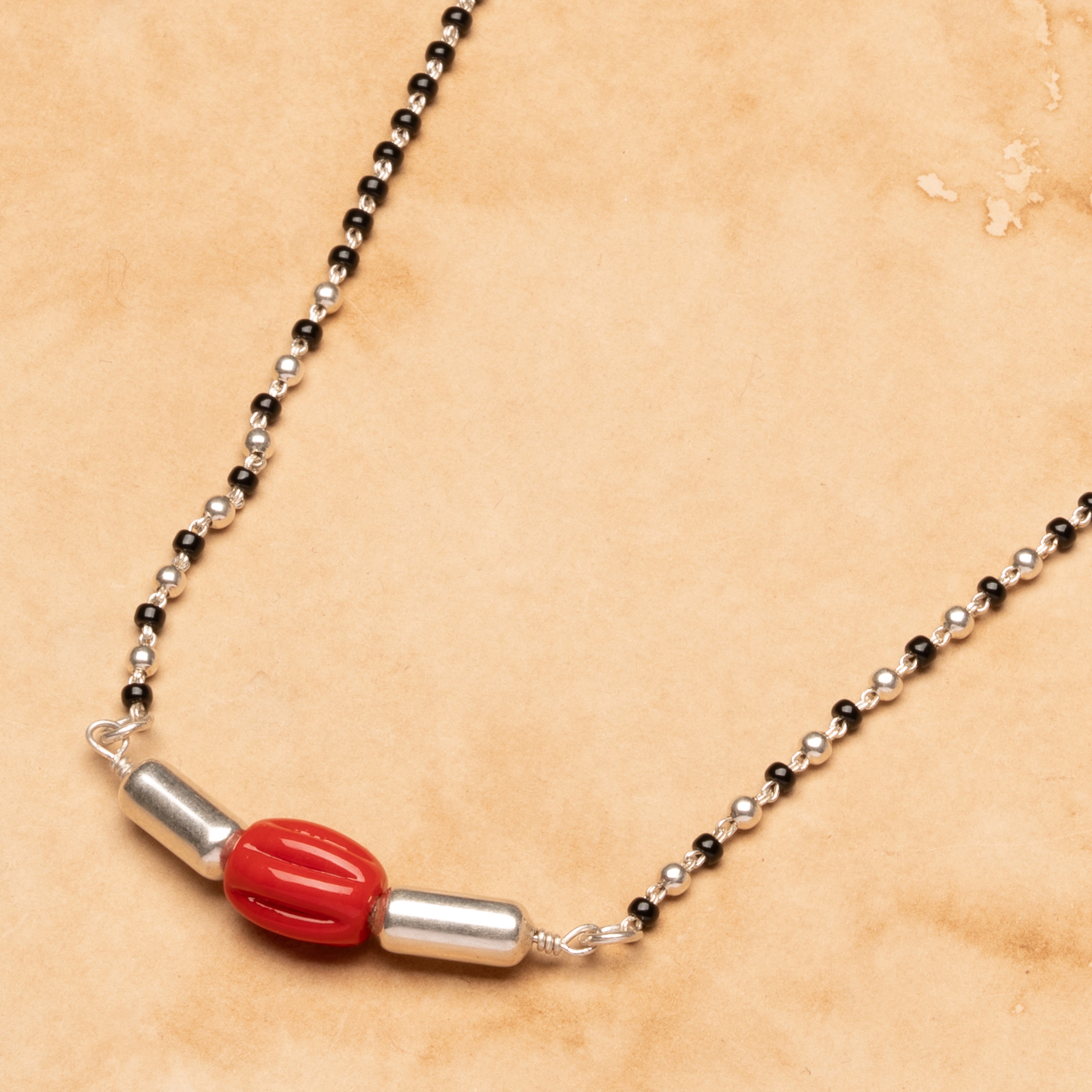 The Coral Bliss Silver Mangalsutra features twin silver cylinder beads that flank a vibrant coral centre stone, all set on a chain of classic black beads and crafted in high‑quality sterling silver. The coral brings warmth, passion, and protection—as coral has long been honored across cultures as a symbol of vitality, emotional healing, and feminine energy.  Light yet bold, this mangalsutra balances heritage and contemporary design, making it perfect for daily wear or for adding a striking focal point to special occasions.