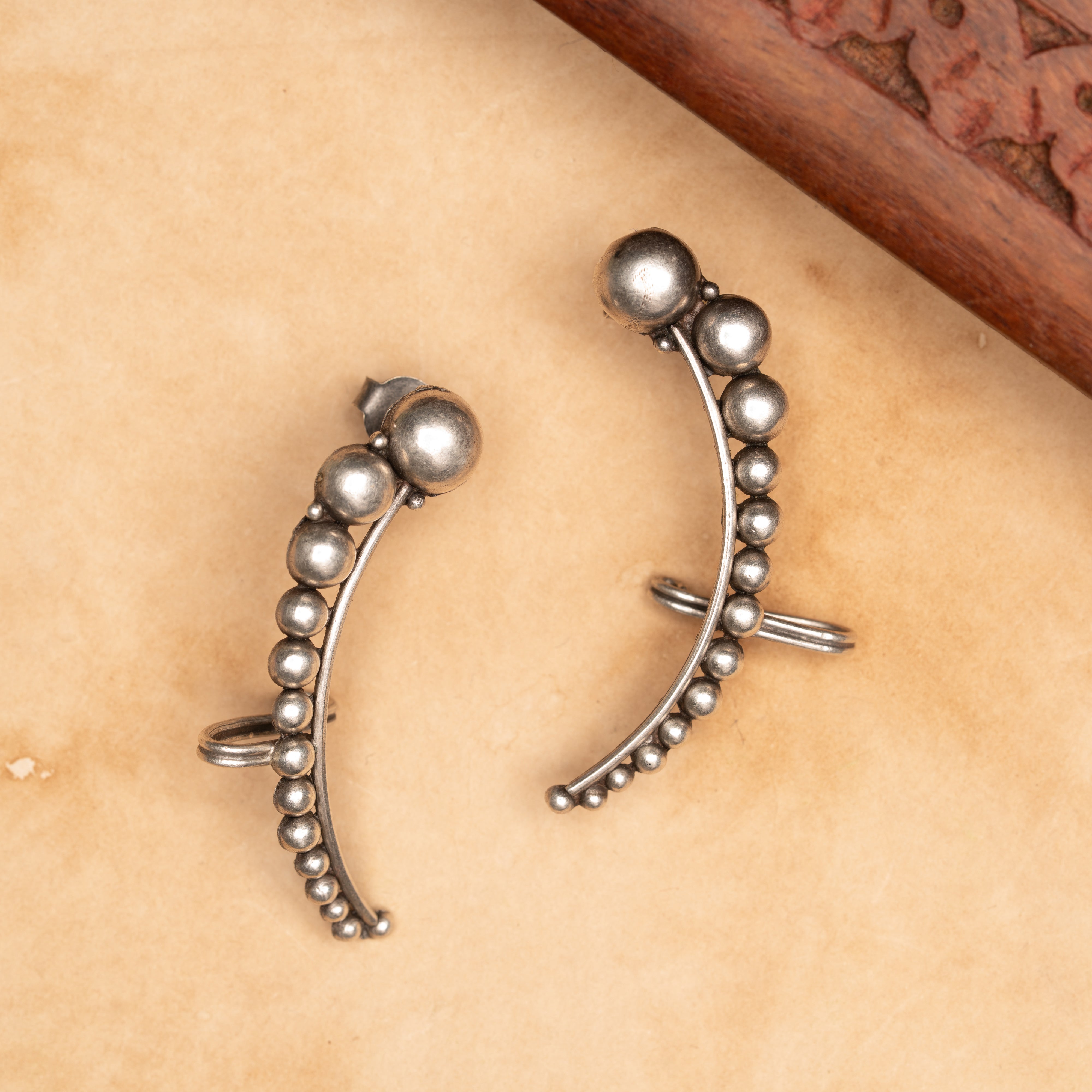 A modern 2.3-inch silver ear cuff featuring a sleek ball design that echoes simplicity and style. Perfectly versatile, it pairs effortlessly with any silver jewelry to elevate your look with subtle sophistication.