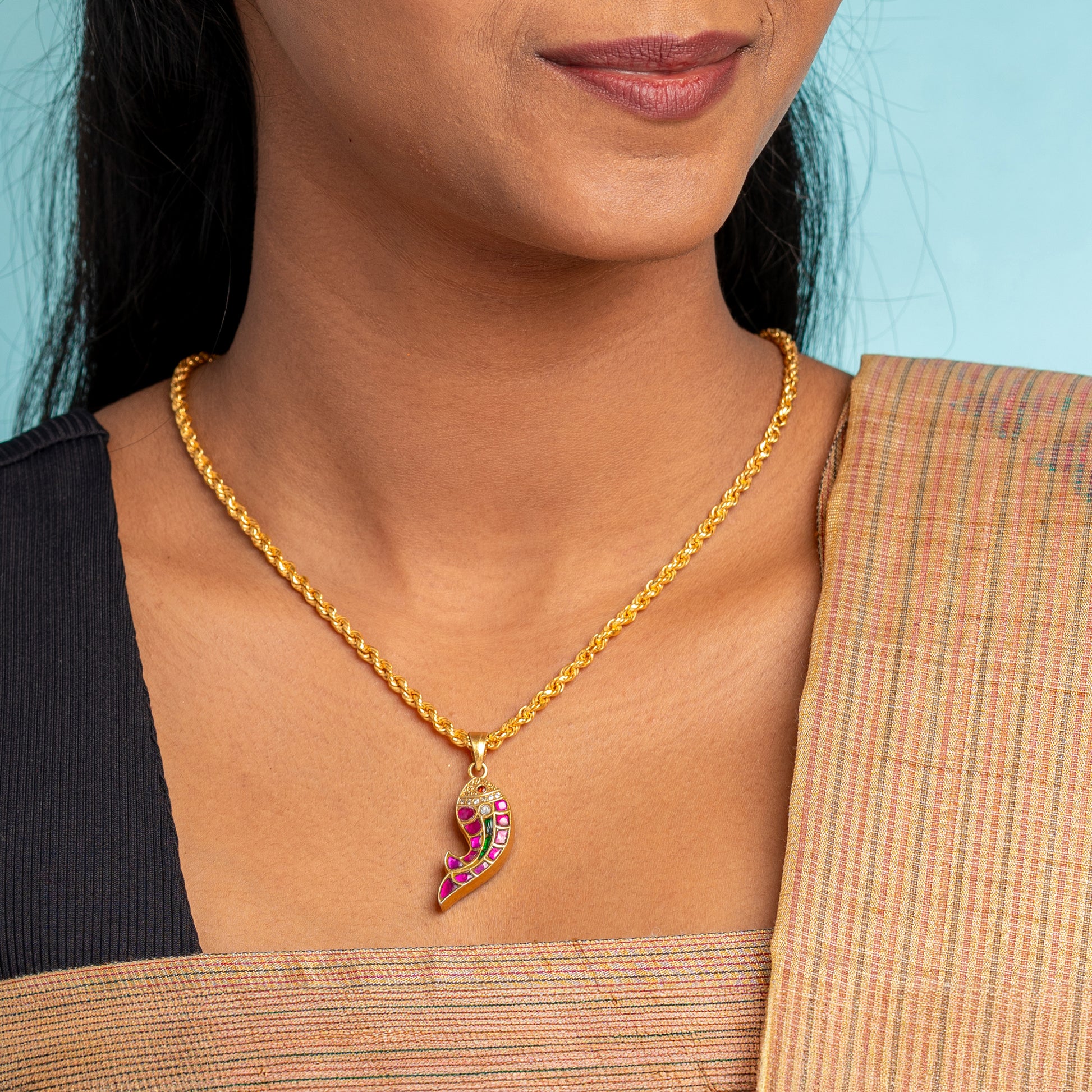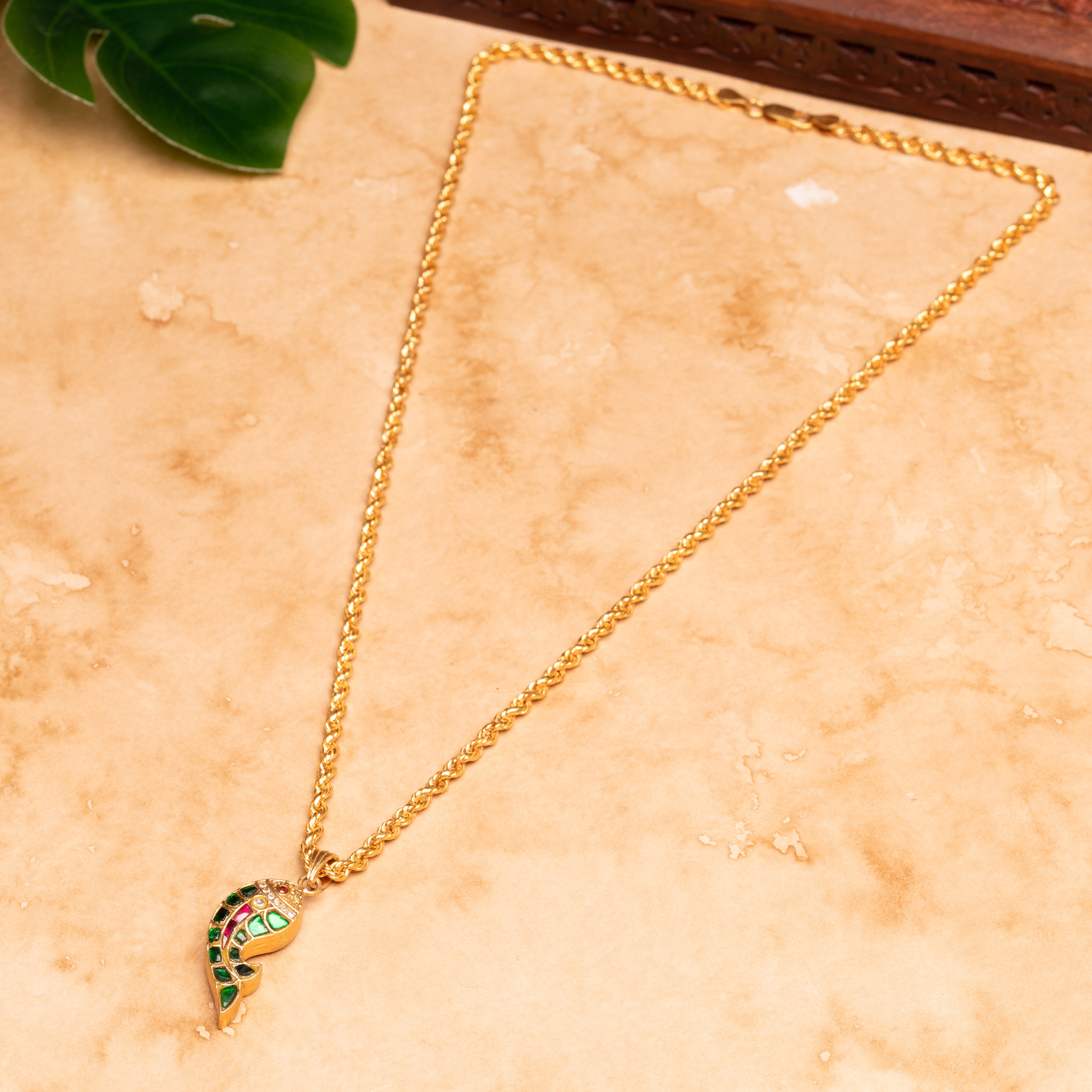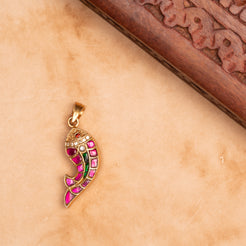A unique and charming fish-shaped pendant crafted in 925 silver with high-quality gold plating. Set with sparkling green stones, it offers a vibrant, playful elegance that stands out beautifully in any refined look. One side green and other side pink stone