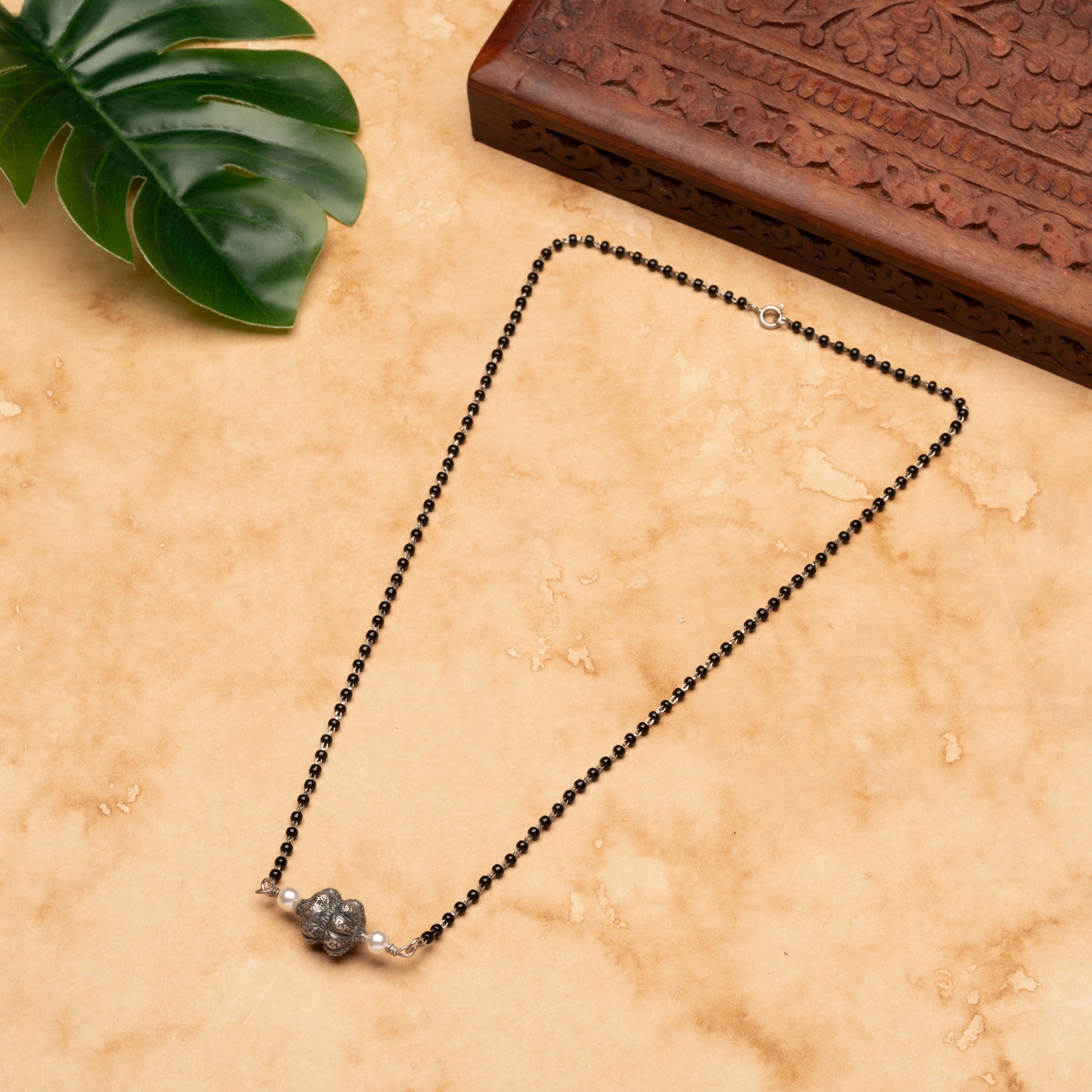 The Kala Silver Bead Pearls Mangalsutra by Kshityee exquisitely blends timeless elegance with contemporary artistry. At its heart lies a handcrafted designer oxidised silver bead, finished with a subtle polish that enhances its intricate detailing and vintage charm. Flanking this centerpiece are two high-quality crystal pearls that add a lustrous glow, symbolizing purity and sophistication. The mangalsutra is strung on a finely crafted 92.5 sterling silver chain, balancing durability with delicate style. The oxidised polish finish on the bead beautifully contrasts with the radiant pearls, creating a harmonious interplay of textures and tones. Designed for the modern woman who values tradition with a modern twist, this mangalsutra effortlessly transitions from everyday wear to special occasions, making it a versatile and meaningful addition to any jewelry collection.