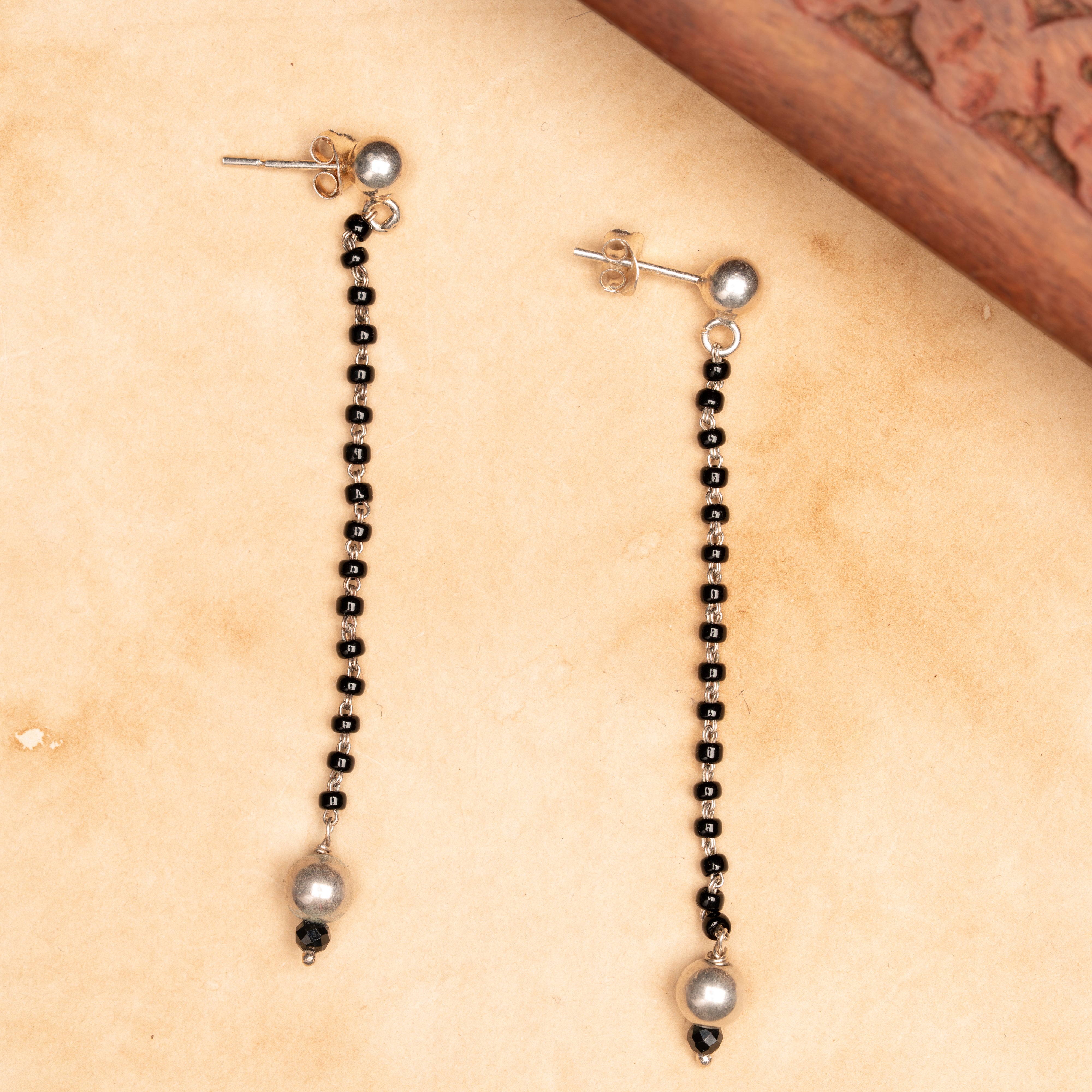 These Elegant Long Mangalsutra Earrings reimagine the traditional mangalsutra style into an elongated form that drapes elegantly. Crafted with fine metals (silver or gold‑finish), they feature black beads or enamel accents, symbolic of protection and marriage, paired with shimmering stones or minimal motifs. Lightweight yet statement‑making, they combine heritage with modern flair for the woman who celebrates both rootedness and style.