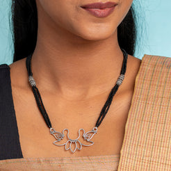 The Padmaja Handmade Silver Pot Mangalsutra features a delicately handcrafted lotus motif blooming from a traditional silver pot, symbolizing purity rising from grounded devotion. Made in 925 sterling silver and strung on a fine chain of classic black beads, this design blends meaningful tradition with artisanal elegance — a piece that celebrates the beauty of growth, love, and inner strength, perfect for everyday wear or quiet celebration.