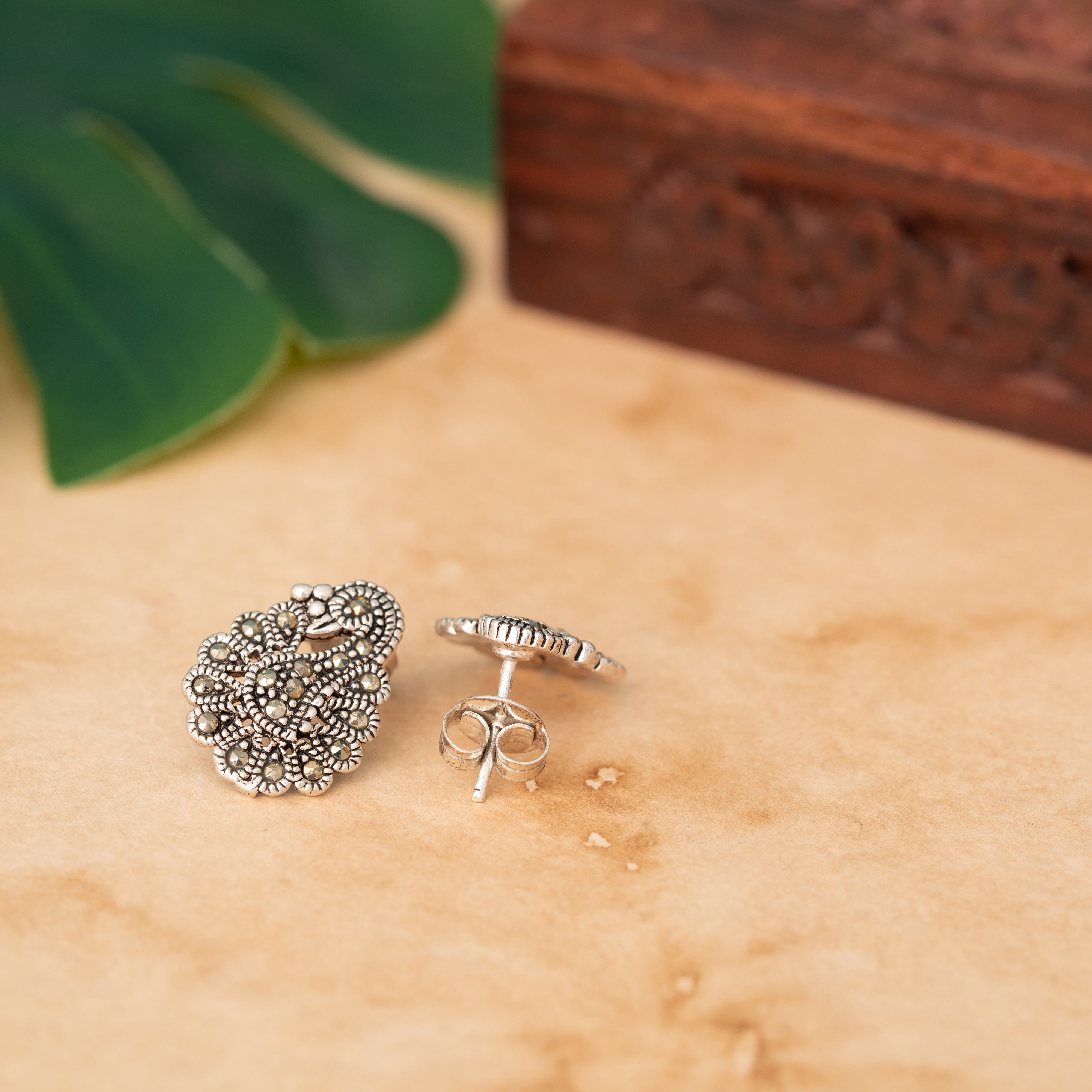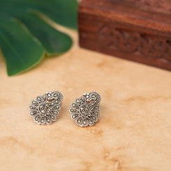 Add a touch of timeless charm with these Peacock Motif Silver Studs, crafted in 925 sterling silver with an oxidized finish. Featuring intricate feather detailing and delicate natural stones, the design blends traditional elegance with a modern edge. Lightweight, nickel-free, and finished with secure push-back closures, they’re perfect for everyday wear or festive occasions.
