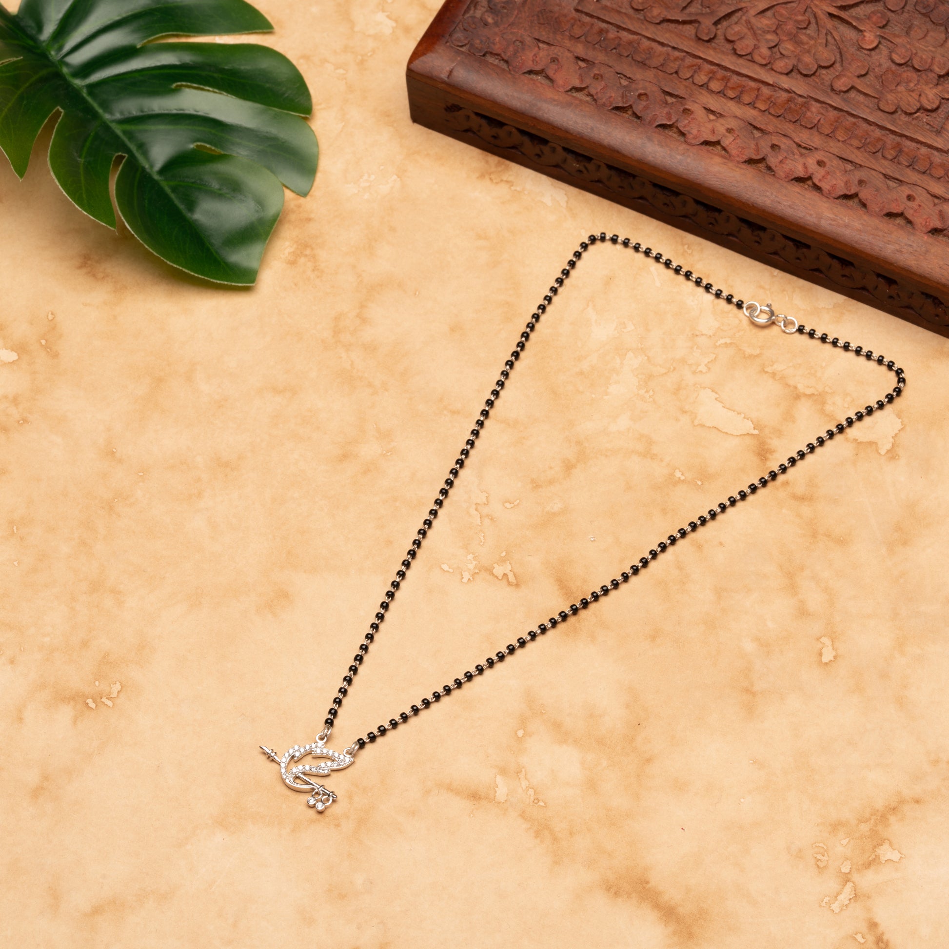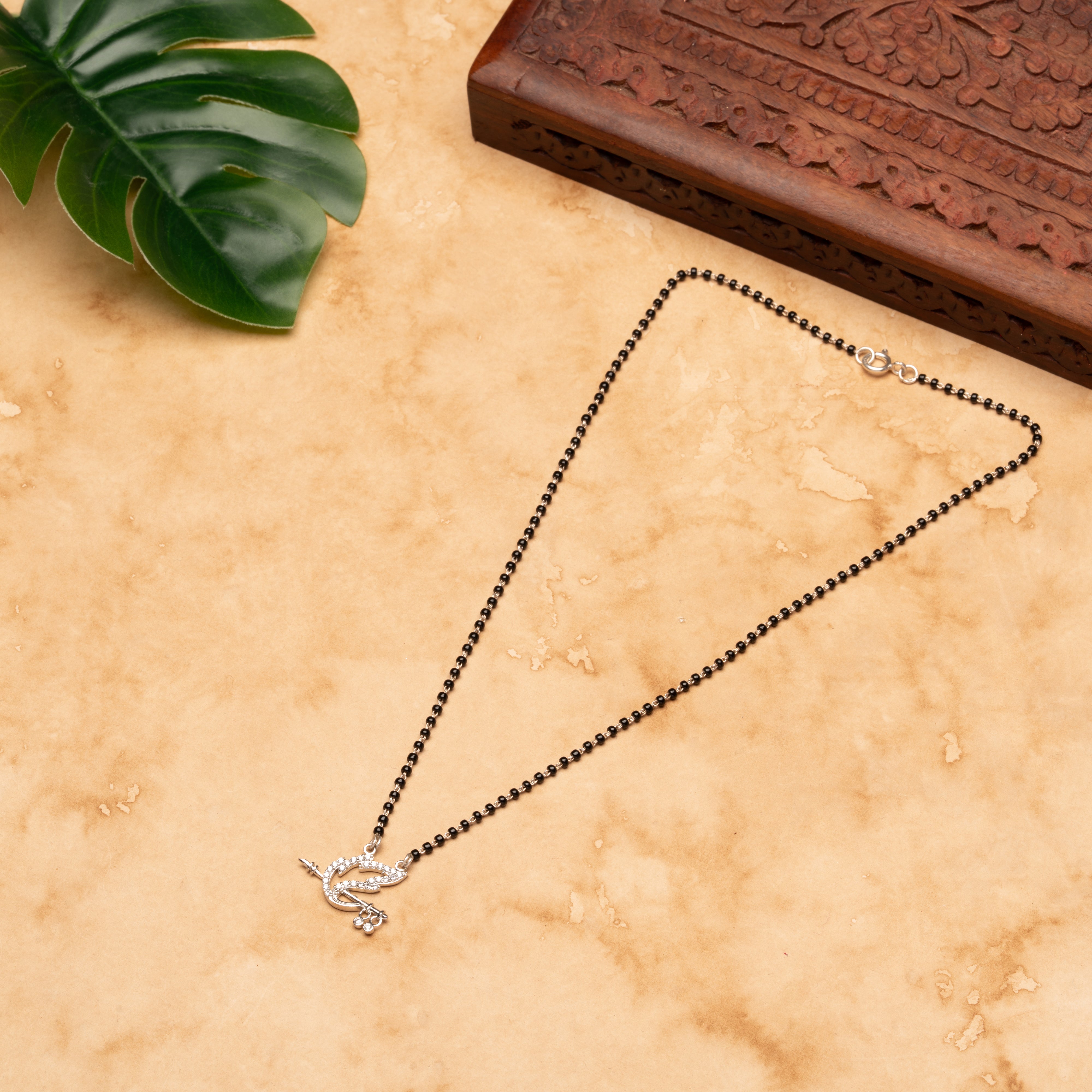 An ode to divine love and soulful connection, the Rasleela Harmony Mangalsutra features an intricately crafted motif of a peacock feather gently entwined with a flute — symbolic of Lord Krishna’s eternal bond with Radha. Set against a backdrop of classic black beads, this mangalsutra blends spiritual symbolism with artistic elegance. It’s more than just an ornament — it’s a story of love, music, and devotion worn close to the heart.