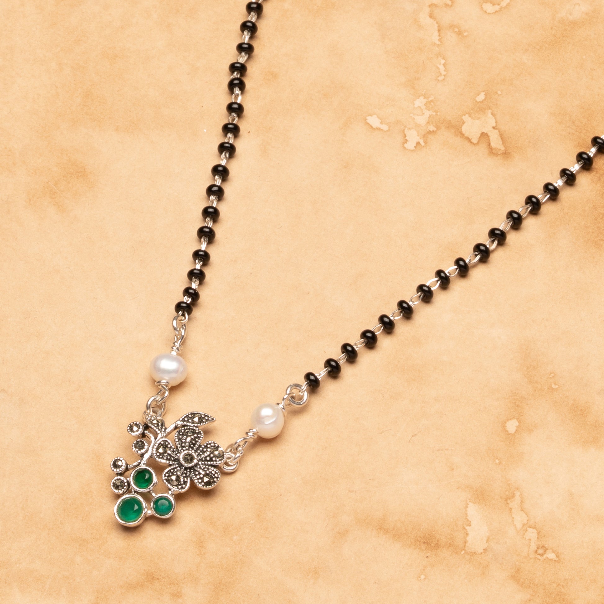 Elevate tradition with a touch of fresh elegance. The Reva Green Stone Mangalsutra is a graceful blend of floral symb...