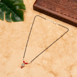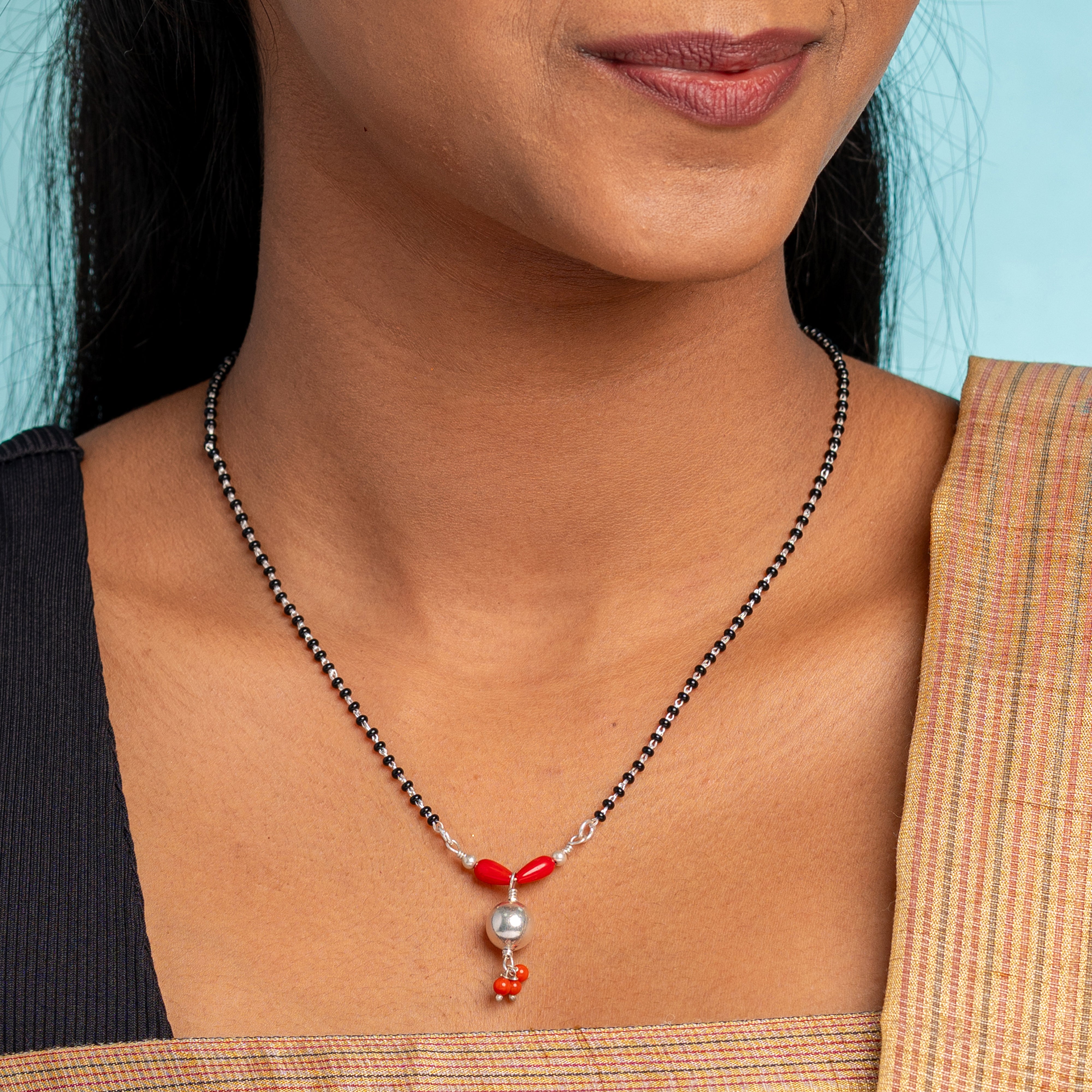 A contemporary twist on tradition, this Silver Bead Coral Mangalsutra combines the purity of handcrafted silver beads with the warmth of natural coral stones. Lightweight yet striking, it's designed for the modern woman who values tradition with a touch of individuality. The black mangalsutra thread weaves it all together, symbolizing timeless connection and grace.