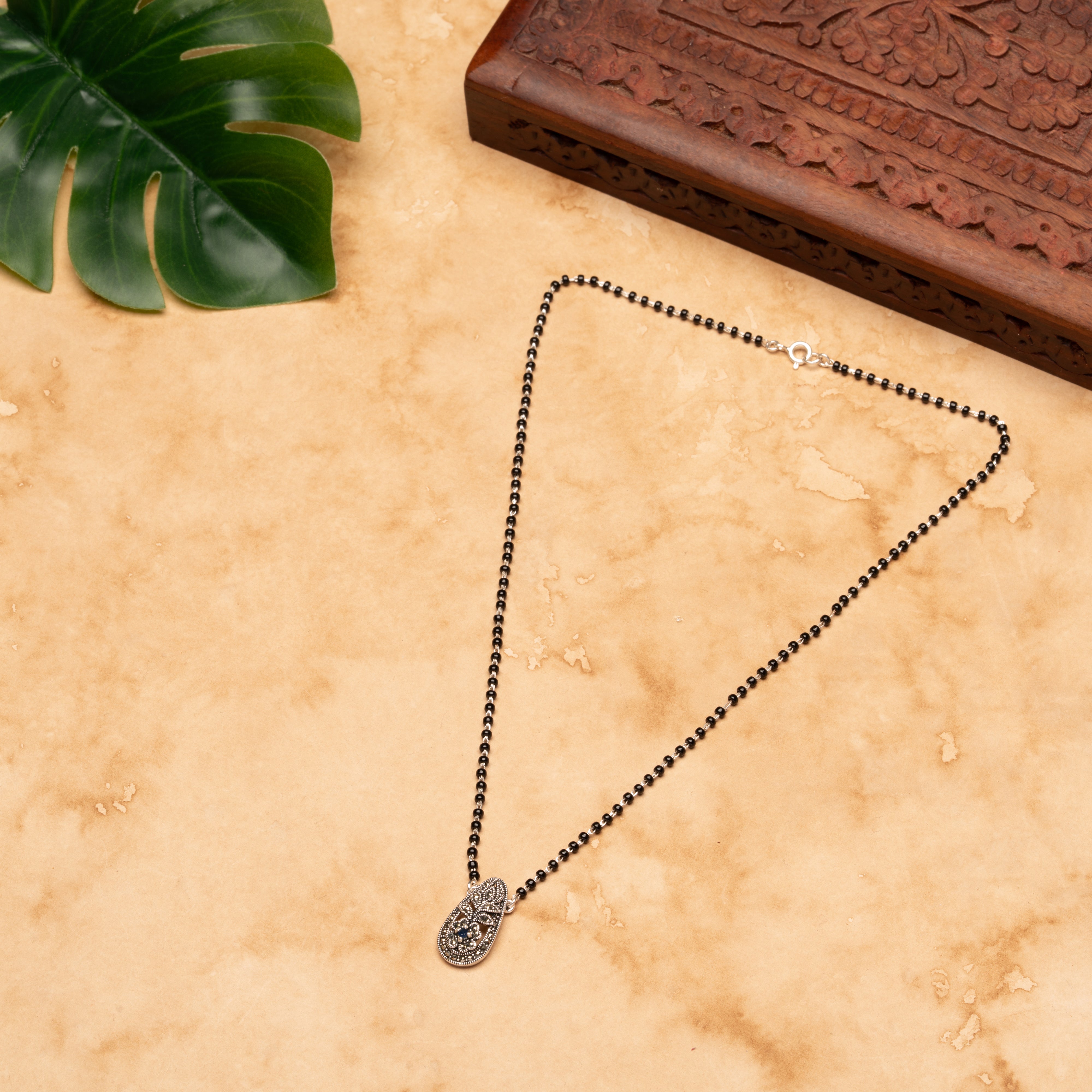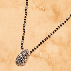 The Stone Blossom Silver Mangalsutra features a delicate floral motif crafted in 925 sterling silver, accented with shimmering stones that add a soft sparkle without overpowering its traditional charm. Set on a strand of classic black beads, this piece reflects grace, balance, and timeless femininity, making it ideal for everyday elegance or meaningful occasions.