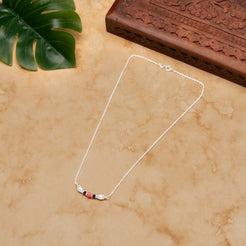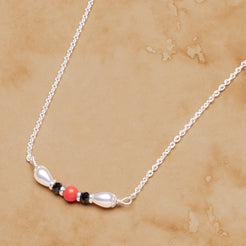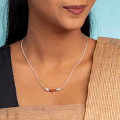 The Veera Pearl Coral Mangalsutra by Kshityee beautifully combines strength and elegance in a minimalist design. Featuring high-quality crystal pearls shaped into graceful drops, this mangalsutra centers a vibrant coral bead that symbolizes vitality and protection. Strung on a delicate sterling silver chain, the piece offers a subtle yet striking contrast between the soft shimmer of the pearls and the warm glow of the coral. Designed to suit everyone, regardless of age or occasion, its timeless minimalism makes it a versatile and meaningful accessory that effortlessly complements both traditional and modern styles.