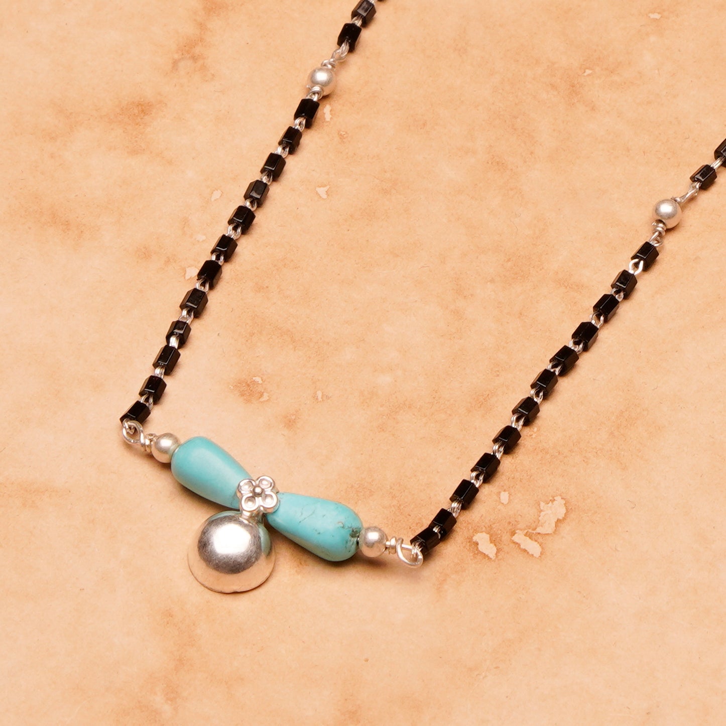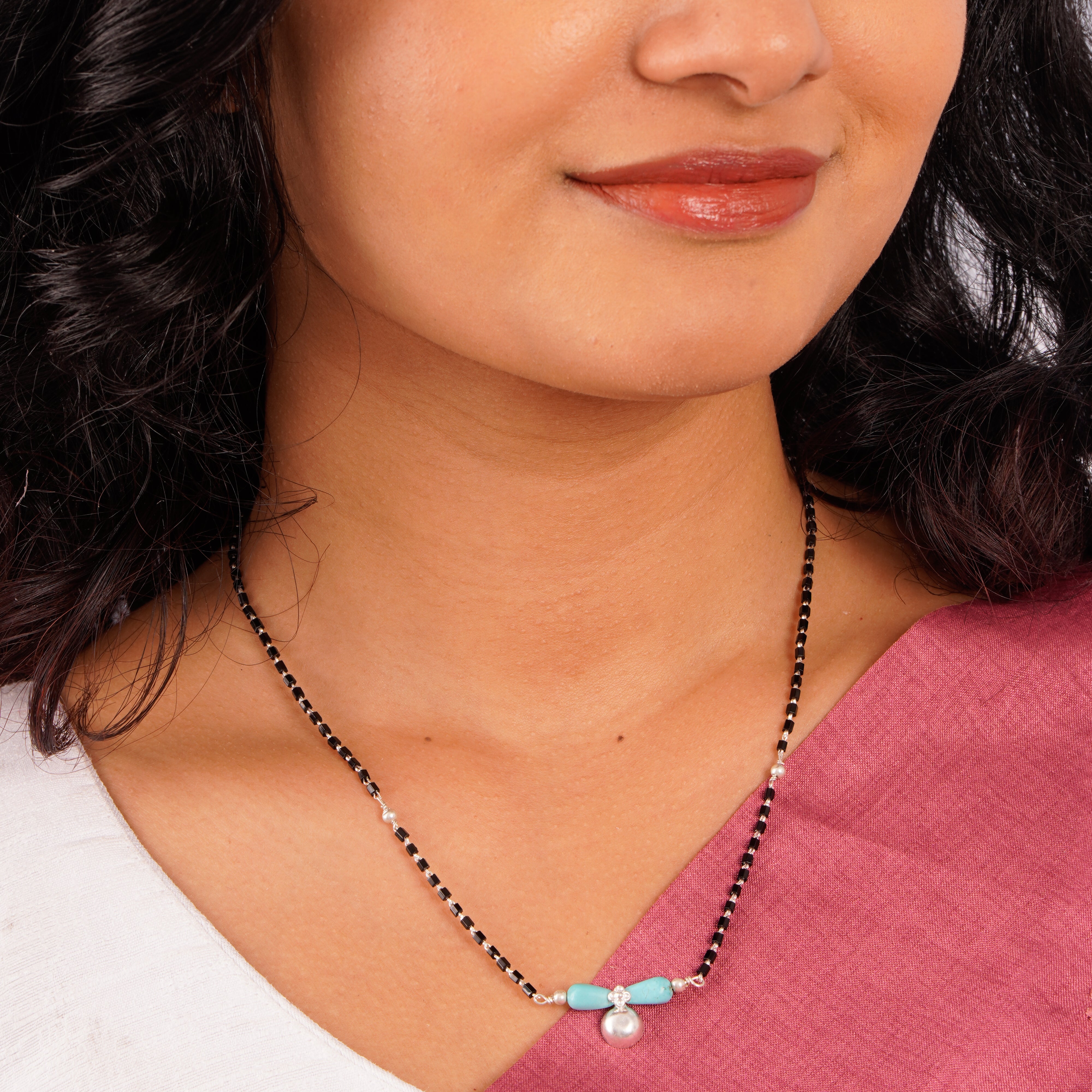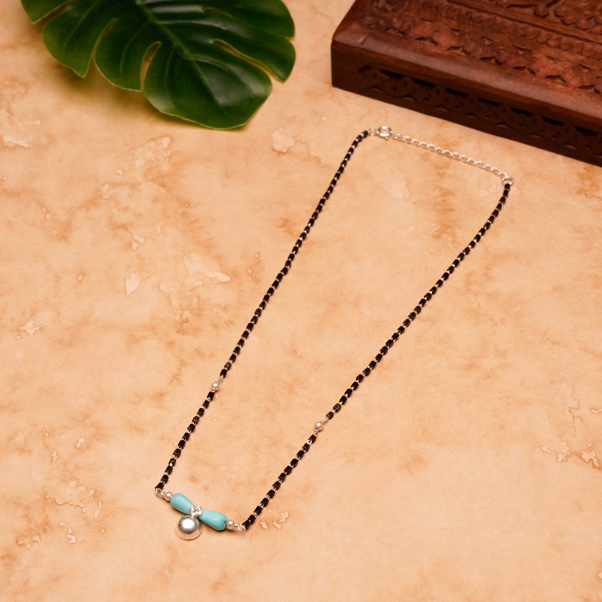 The Wati Fusion Mangalsutra beautifully combines tradition with modernity, featuring a classic silver wati pendant complemented by natural turquoise beads. The vibrant turquoise brings a serene, earthy charm, while the sleek chain enhances its contemporary appeal. This piece is perfect for those who seek a meaningful and stylish accessory.